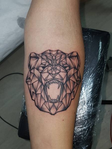 Une envie d'un tatouage d'ours en trait fin, Mathias vous propose le tatouage géométrique.
